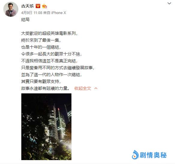 漫威超级英雄电影《复仇者联盟4:终局之战》将于4月24日在中国上映。日前著名“超英迷”古天乐在网络上发文感叹,不舍“复联”系列迎来大结局。