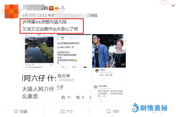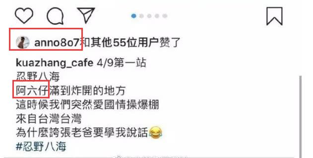 账号“anno8o7”就是阮经天前女友许玮甯本人,她点赞了上面这一条ins内容,其中看三个字:阿六仔!这是台湾某些人对中国大陆的一种侮辱称呼,不少TD艺人经常用这个词来称呼内地。许玮甯居然明目张胆点赞,过去一天了都没有取消点赞,看来不是手滑,是故意点赞的。