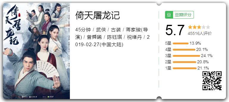 《倚天屠龙记》开播前期已经因慢镜头过多,让不少观众失去了观看耐心,豆瓣评分仅为5.7分。
