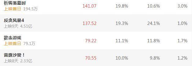 如今看来《祈祷落幕时》最大的对手就是目前正在热映的《反贪风暴4》了。古天乐此片确实不错,上映以来票房口碑双丰收,而且目前票房后劲也极其强悍,总票房极有可能突破8亿大关,创下古天乐作品内地票房新高!