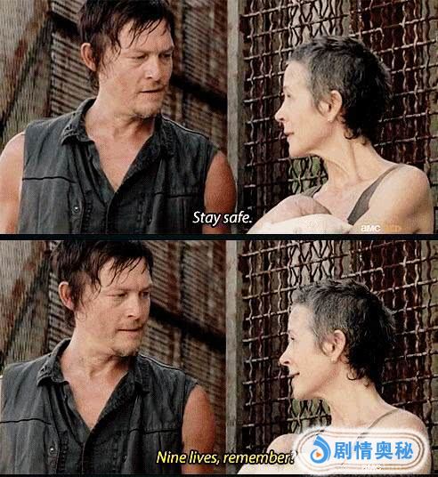 在这部剧的前几季,卡罗尔和达里尔的关系很好,第九季的大结局让他们再次走到了一起。然而在回顾前几季时,有一条不详的对话线索,希望不是在暗示两人的命运。当时的弩哥要卡罗尔注意安全,卡罗尔告诉他,“九条命,记得吗?”。大家看看下面的截图:
