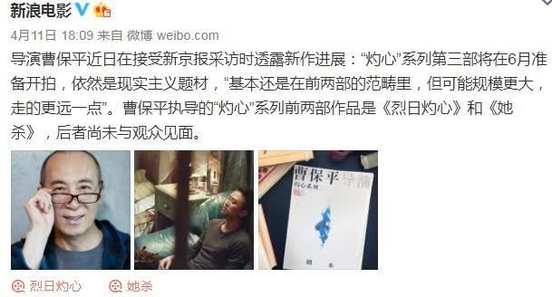 近日,曹保平接受采访表示“灼心”系列第三部将在6月准备开拍,依然是现实主义题材,“基本还是在前两部的范畴里,但可能规模更大,走的更远一点”。他将打造“灼心”系列三部曲。