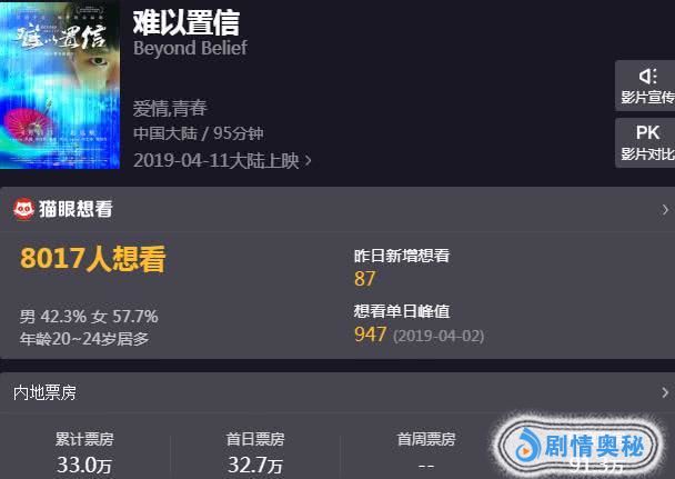 这部《难以置信》从剧情上来说还是可圈可点的,至少没有出现堕胎、车祸出国等烂俗情节。不过该片主创都不太出名,是一部小成本之作,上映后票房还是扑街了,首日仅有33万,这点成绩可谓相当悲剧。