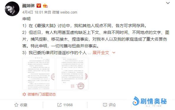 4月11日,《最强大脑》选手梅轩宇通过微博发布道歉声明,承认自己捏造魏坤琳与制片人桑洁存在不正当男女关系的谣言,并促使网友传播、发酵,最终成为事件登上热搜。