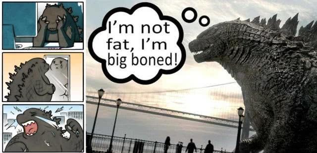 日本网友有几张漫画调侃哥斯拉太胖,老版《哥斯拉大战金刚》中哥斯拉被金刚拿树捅的图片也被配文“多吃素”,不过美国网友给他平反“我不是胖,只是壮!”