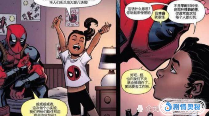 第二个就是死侍和一个普通人类女子所生了,那时候真的是个意外,死侍还没做好要孩子的准备,这个意外就变成了惊吓了,然后就直接把她送人了,但是这位女儿的能力很无敌,就是每次死后就回到她16岁样子。