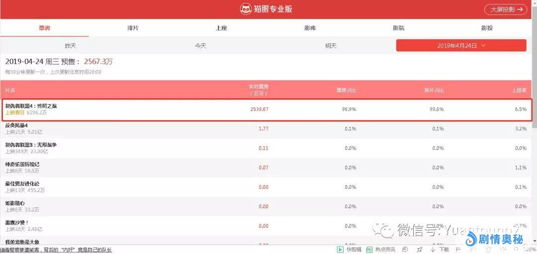 截止发文时间,根据猫眼专业版预售票房实时数据显示,漫威宇宙电影《复仇者联盟4》从中午12时开放票房预售至今,影片在4月24日预售票房已经突破6000万,票房占比高达98.9%,排片比率99.6%,上座率6.5%,几乎从同档热映的多部影片中脱颖而出,一度做到了为映先火,赚足观众期待值。