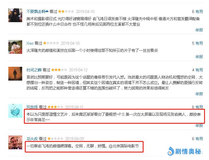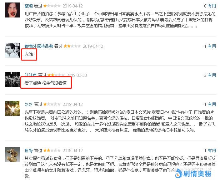 从观影后影迷的口碑中可以得知看,影片开篇节奏异常缓慢,信息的给予也不甚高明,俞飞鸿的脸虽然美丽,但是也显得无趣了。前半段母女的相处有点奇怪,情绪逻辑没有找到落点,所以感动也好愤怒也好落泪也好都莫名其妙的。而且影片后半段其实是袁元的心结修复之旅,但是除了日本婆婆的行为是连贯的有逻辑的,其他人的情绪也都是破裂的断层的。