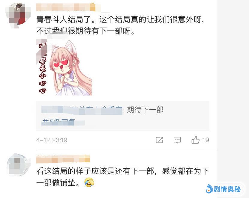 《青春斗》从1—38我陪它走完了。很多人觉得没看见自己青春的影子,但是我感觉它把青春说的很清楚。大结局让人很有遗憾。我们最爱的香葱CP真的再就没有在一起。这不就是现实么,大学那个把你抛弃了的男朋友,就那么肯定你不嫁人,多年后回来和你复合。错过的才是青春。向真的那句”虽然没成功,但我成长了。“