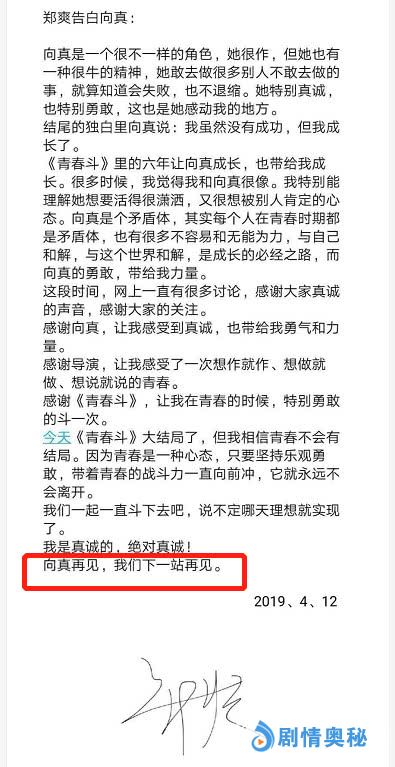 郑爽发文告别向真,看完我竟然有些感动,真诚的。确实郑爽能在剧里随便作是她最幸福的。她也觉得和向真很想,感谢这个角色。从郑爽的文章中也最后一句话说:再见向真,我们下一站见。是不是暗含还有下一部呢。确实结局有遗憾啊。