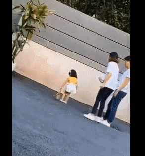 当时正面对一堵墙,妞妞去哪乱跑?你那一脚,小姑娘差点弹起来。