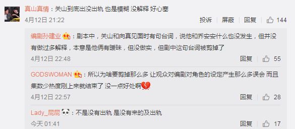 在同情真真的同时,大家也对出轨的关山以及说谎的乔安安(说是回老家实则是给关山过生日)表示由衷不屑。但根据扮演两位的演员口中得知其实关山其实没有劈腿乔安安。在大结局当日,明莉(乔安安的扮演者)还发了条微博表示她是冤枉的。
