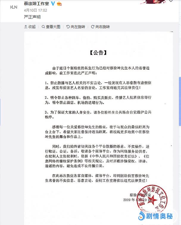 而最近一段时间关于蔡徐坤工作室却有很多的大动作啊,其中的一个矛头直指蔡徐坤曾经表示最爱的ikun们!针对有一些个粉丝们不理智的追星以及崇拜行为,导致了对蔡徐坤的个人名誉以及人身安全的影响,所以公开发文让ikun们保持理智,在追星的时候也要遵纪守法!