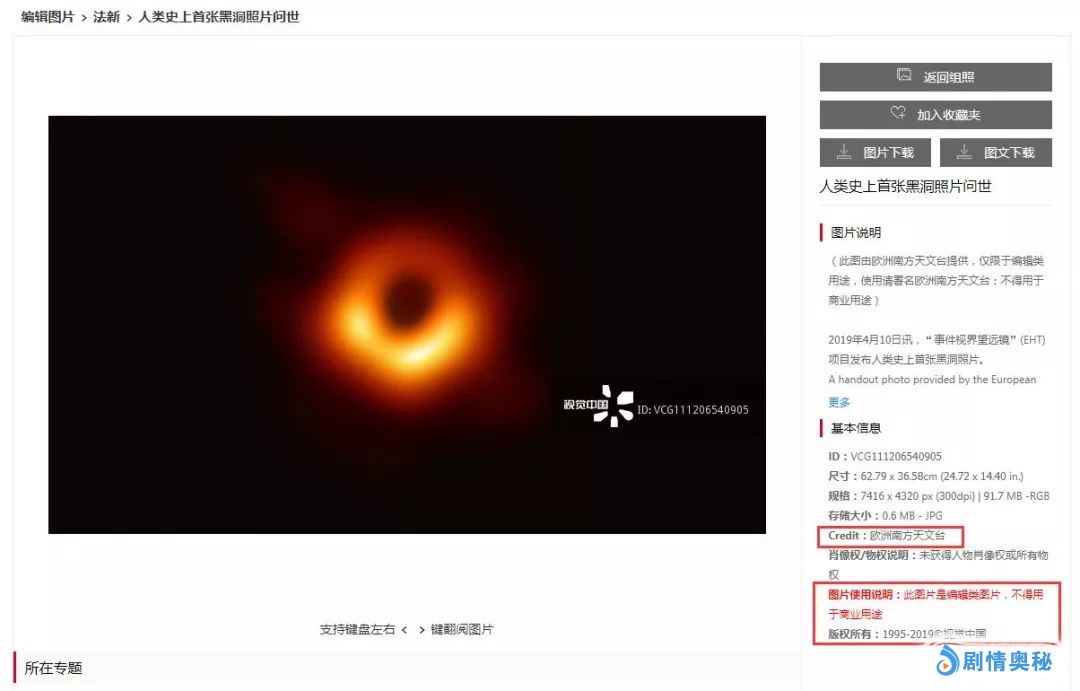 ——4月10日晚,人类首张黑洞照片在全球多地同步发布。这张由欧洲南方天文台提供、“只要标注来源则全世界可用”(中科院院士语)的照片,竟被视觉中国标注版权且须付费购买,单张约2000元。激起瓜众特别是无数自媒体的反弹:天下自媒体苦视觉中国久矣!4月11日下午,@共青团中央也正面刚了“视觉中国”:国旗国徽的版权也是贵公司的?而该微博评论区则变成了“大型算账现场”,凤凰、百度、新浪、海尔、苏宁等知名企业的LOGO都被标注成了视觉中国的版权作品。批评铺天盖地,这是被认为最有趣最解气的一条评论。