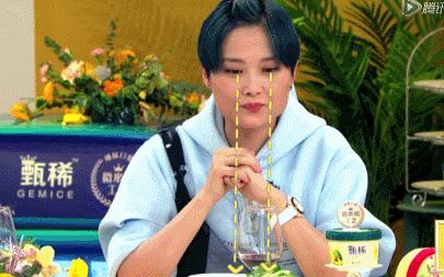 在关晓彤被美味包围的同时,另一位嘉宾的眼神也充满了深深的渴望。她正是上期将整个演播室气氛搞到火热的李宇春同学,凭借一个蓝纹芝士让周围的人对她钦佩起来。想要驾驭住如此有趣的味道,气场必然不一般。不过此时的她却因为转盘焦急不已。眼睛一直紧盯着刚才晓彤尝试过的凉菜。直到转盘转到了她那儿,才啃放心地拿着夸张去体验新的味道。终于吃到,再满意地一笑,估计味道不错。
