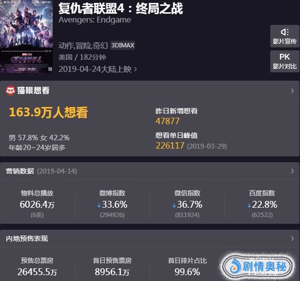 但目前看来《复仇者联盟4》作为一个系列的“终局之战”,票房爆发力惊人,零点场最终过亿已经毫无疑问了,最终预售票房或许将高达4个亿,首日票房更是极有可能打破《捉妖记2》的首日5.46亿影史纪录。