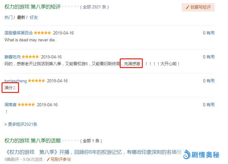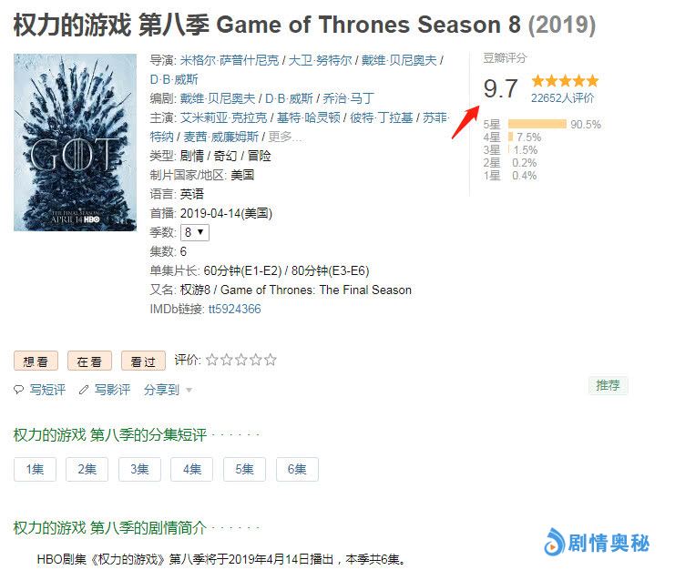 这部剧在太阳系范围内的影响力已经无需赘言。古老而黑暗的中世纪,一个弱女子怎么活下来?一千年以前,你的祖先经历过怎样的生死劫难?也许会在《权力的游戏》中的女性角色身上找到答案。在截止发文时间,该剧IMDb 9.5,标记人数超过143万,正式超越《兄弟连》成为评价第二高美剧,而除此之外,国内豆瓣网更是给出了9.7的高分好评,一定程度上也迎合了国内观众的口味,获得了观众的一致好评。