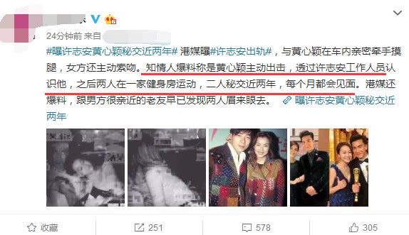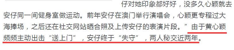 据知情人透露,是女方黄心颖主动出击的,她通过许志安工作人员认识他,后来两个人一起去健身房做运动,私下交往已经长达两年时间。许志安在澳门举办演唱会时,黄心颖亲自去现场捧场。因为黄心颖频繁主动出击送上门,许志安最终倒在了石榴裙下,一个愿打一个愿挨,丝毫不考虑世俗眼光。