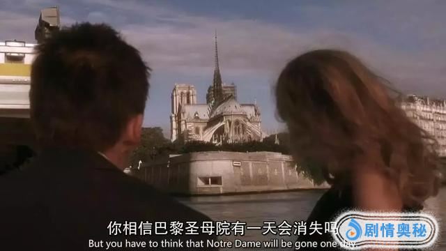 男主在讲完“德军士兵不舍得炸巴黎圣母院”的浪漫故事后,两人一起回头眺望巴黎圣母院,于是有了今天刷屏的那句话——