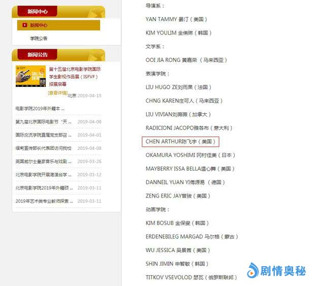 根据北京电影学院官网公示名单“北京电影学院2019年外籍本科生录取名单(中文授课项目)”显示,陈凯歌、陈红之子陈飞宇以外籍(美国)学生的身份被表演学院录取。