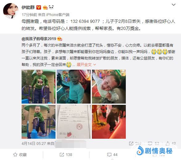 4月16号晚上,伊能静转发了一个丢失儿童母亲的博文,配文说:母親谢霞,电话号码是13263949077,儿子于2月8日丢失,感谢各位好心人的转发,希望各位好心人能提供线索,帮帮家中,有20万奖金。