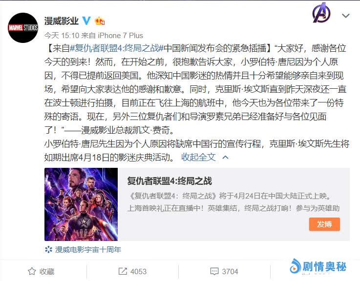 4月17日,在上海举行的《复联4》新闻发布会上,漫威总裁凯文·费奇率先登场,称“钢铁侠”小罗伯特·唐尼因为个人原因没能前来:“大家好,感谢各位今天的到来!然而,在开始之前,很抱歉告诉大家,小罗伯特·唐尼因为个人原因,不得已提前返回美国。他深知中国影迷的热情并且十分希望能够亲自来到现场,希望向大家表达他的感谢和歉意。”
