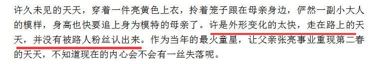 当年天天算是一个超火爆的童星,久没露面的天天已经变成了小小男子汉,身高突飞猛进,快要赶上妈妈个头了。或许是外形变化太快,天天走在街头都没有被路人和粉丝认出来。天天当年大红大紫,也让爸爸张亮再次翻红,如今现身街头无人识啊!