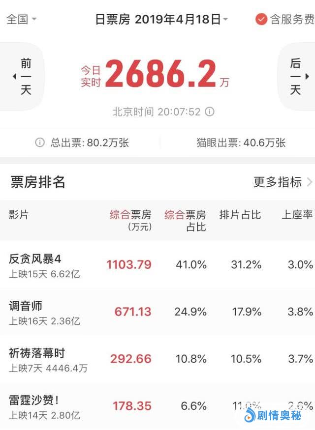 正是因为《复联4》即将上映,目前国内电影市场的票房成绩就显得一般般了,从实时票房成绩来看,由古天乐等人主演的国产动作片《反贪风暴4》,目前上映15天连续拿下15天单日票房冠军,总票房成绩突破6.6亿,这样的票房成绩是很多人没有料到的。