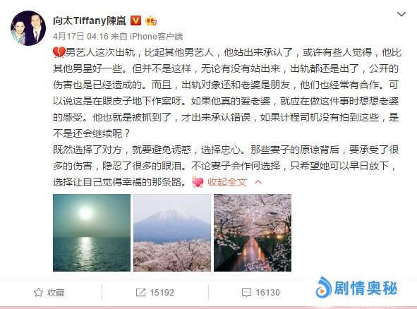 4月17日凌晨4点多,向太先是谴责了出轨的男艺人,被抓到了才出来承认错误,如果计程司机没有拍到这些,是不是还会继续呢?接着又说到那些妻子的原谅背后,要承受了很多的伤害,隐忍了很多的眼泪。