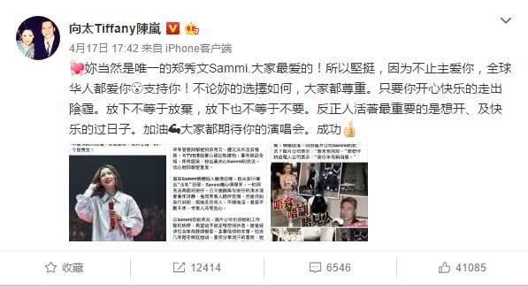 接着4月17日下午五点多,向太又发了一条微博喊各方面郑秀文,不论你的选择如何,大家都尊重,只要你开心快乐的走出阴霾,放下不等于放弃,放下也不等于不要,反正人活着最重要的是想开、及快乐的过日子。