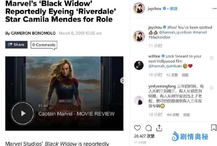 周杰伦在自己的ins上分享一篇文章,报道称漫威新作《黑寡妇》在考虑加入一位非白人女性角色,在备选名单中,配图出现了昆凌。周杰伦转发并@昆凌,恭喜妻子被看上。