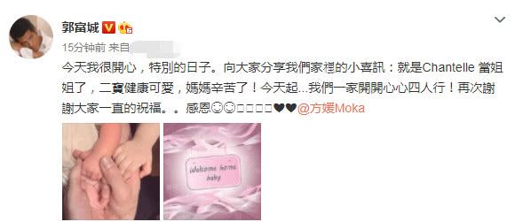 而在4月18日晚上,郭富城在微博上公布喜讯,宣布妻子方媛剩下二胎,郭富城在微博上写道:“今天我很开心,特別的日子。向大家分享我们家里的小喜讯:就是Chantelle 当姐姐了,二宝健康可愛,妈妈辛苦了!今天起...我们一家开开心心四人行!再次谢谢大家一直的祝福。。感恩”。