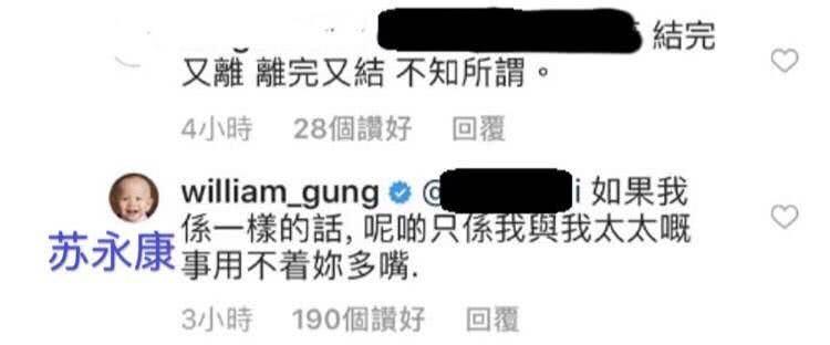 身为许志安郑秀文的多年好友,苏永康同样发了爱心和加油的表情符号对郑秀文以表支持,却遭到许多网友的激烈责问,例如“你们是同类,有什么资格讲话?”“结完婚又离,离完婚又结婚,不知所谓”等,通常艺人不会对网友恶意攻击的言论作出回应,但也许是因为网友的言论正中要害,苏永康竟在郑秀文的声明下和网友展开舌战。