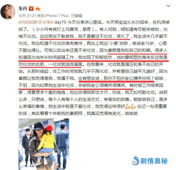 朱丹说熟悉她的朋友都知道不化妆已经很久了,并不是最近不化妆,她也知道素颜有些憔悴,被说老了10岁。朱丹表示自己出门都不化妆,称素颜是她和自己的和解。以前高强度工作导致朱丹患上了抑郁症,身体抗拒化妆,一化妆就会泪流满面,所以非工作时间几乎不化妆。朱丹还说素颜也不怕老公周一围嫌弃,因为如果生活中化妆的话,才会被周一围很嫌弃。