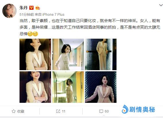 当天晚上,朱丹分享了在酒店拍摄的照片,她说:当然,敢于素颜,也在于知道自己只要化妆,就会有不一样的神采。女人能有多面,是种荣耀……这是昨天工作结束回酒店同事的抓拍,是不是有点笑的太肆无忌惮。