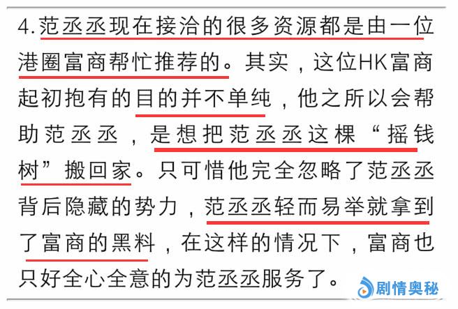 有知情人士发文爆料,说范丞丞目前很多资源都是由一个港圈富商帮忙推荐的,但是这位富商目的不单纯,帮助范丞丞是有额外目的,想把范丞丞搬回家。但是对方忽视了范丞丞背后的势力,范丞丞轻而易举拿到富商黑料,于是富商认怂了,不得不继续全心全意服务范丞丞。