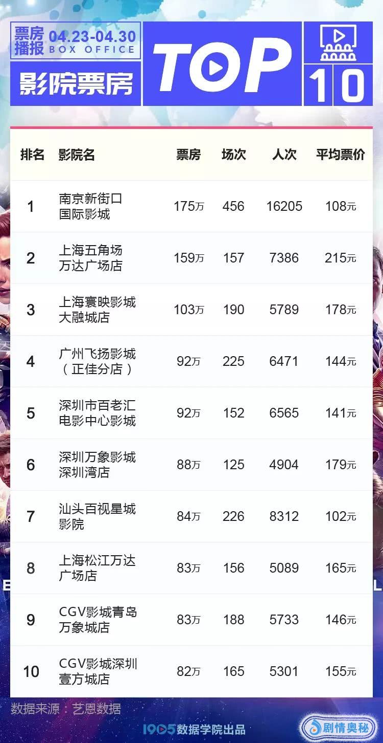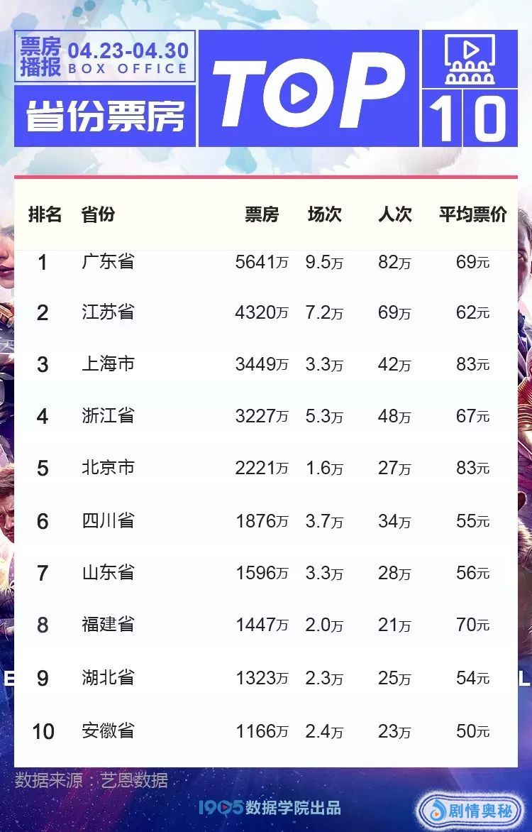 省份方面,广东省以5641万元的《复联4》预售票房以及近10万场排片领先其他省份,其次为江苏省,报收票房4320万元。从数据中可以看到,由于包含较多一线、二线城市,广东省、江苏省不仅在场次数量上占领优势,并且平均票价处于全国平均水平,从而促使这两个省份票房处于榜单前列。