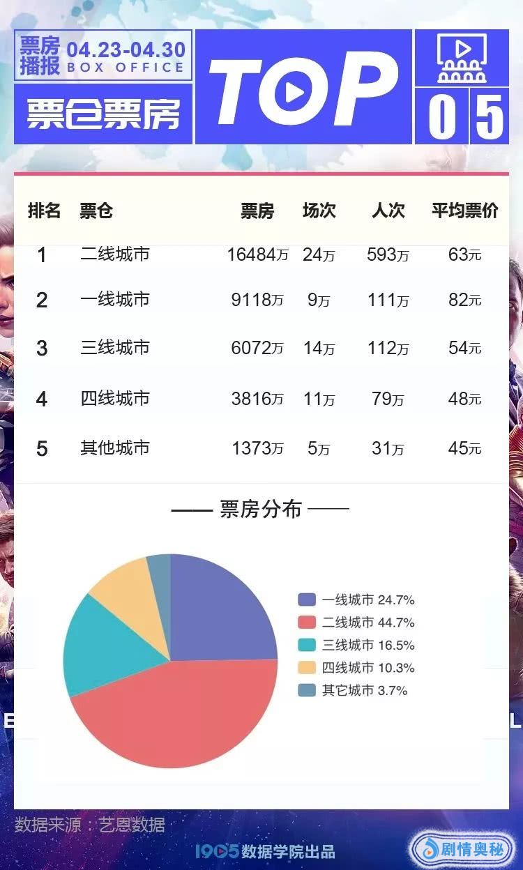 线级城市方面,二线城市继续保持电影市场最大票仓地位,票房报收超1亿元,票房占比44.7%,是一线城市票房的近2倍,一方面在于二线城市观影场次、观影人次均大幅领先其他线级城市,另一方面,其平均票价63元处于全国平均值正常范围内,较多的场次以及相对合理的票价,有效助力二线城市成为《复联4》第一票仓。