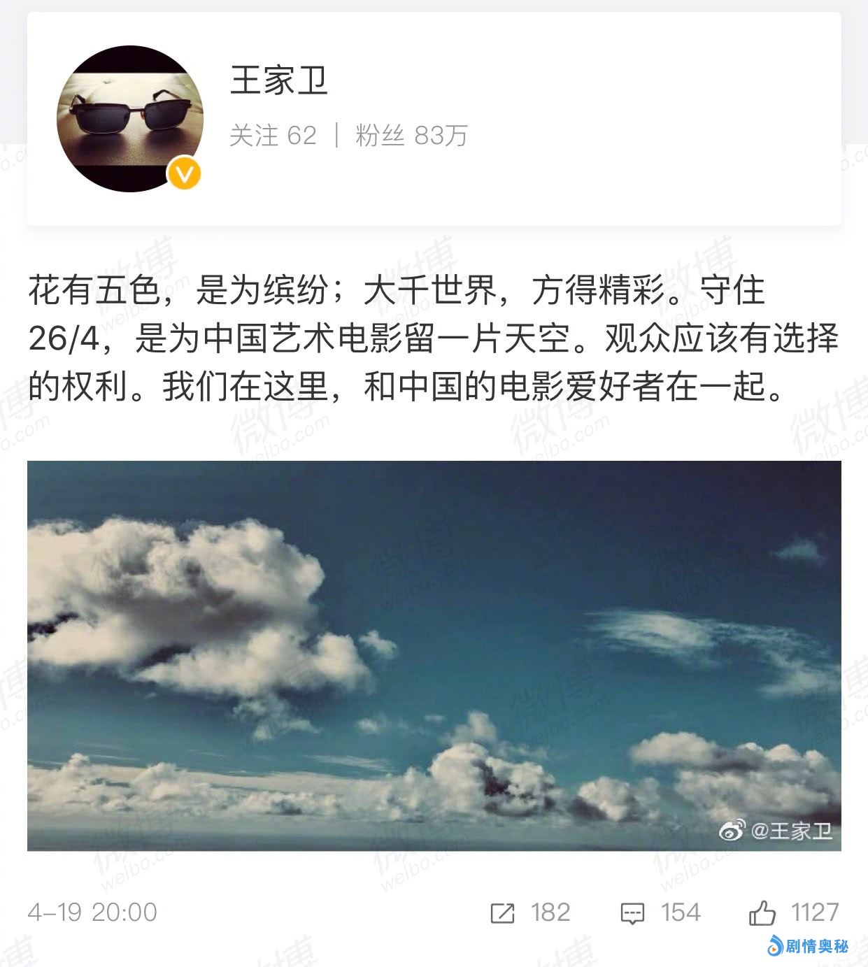 《撞死了一只羊》的监制王家卫也在网上发声,呼吁能提高电影的排片,“花有五色,是为缤纷;大千世界,方得精彩。守住26/4,是为中国艺术电影留一片天空。观众应该有选择的权利。我们在这里,和中国的电影爱好者在一起”。