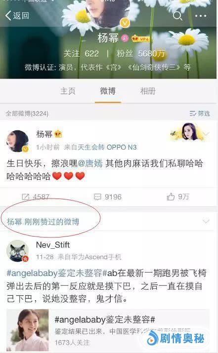 baby的好闺蜜杨幂也曾点赞过相关微博,暗讽baby整容不敢承认。