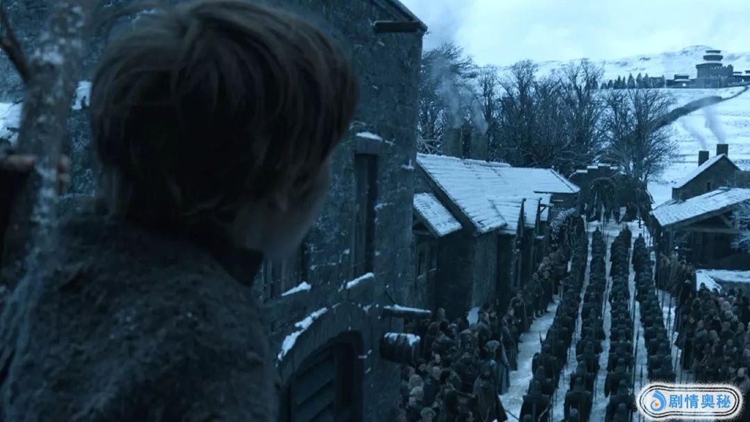 对应着第一季第一集中,布兰爬上城墙观看拜拉席恩的国王军来到临冬城。