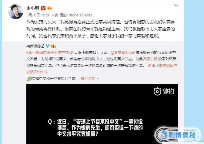 追溯此次舆论风波缘起,正是有些好事的自媒体宣称“李小鹏带着自己的妻子李安琪参加了《甜蜜的行李》这一综艺节目,在节目中李安琪全程说英文,引起了大家的不满,明明就是一个中国人,但是为什么不说中文?在节目中,其丈夫全程说中文,但是李安琪却用英文回。”