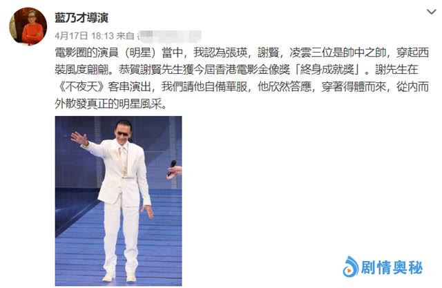 蓝乃才导演比较的神秘,执导完《卫斯理之老猫》之后基本上就淡出了演艺圈,之前就是摄影师,所以他退出电影圈又干回来摄影这行,平时就是周游世界,品尝美食,经常在社交账号上发布自己的足迹。虽然离开圈子比较久,不过他还是关注的,4月17日他发文祝贺谢贤获得香港电影金像奖终身成就奖,还提到他和谢贤1987年合作《不夜天》的一件小事,当年他让谢贤自备华服,然后谢贤欣然答应,并且穿着得体而来,从内而外散发真正的明星风采。