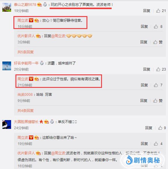 有粉丝留言说:玩的开心之余别忘了弄黄狗,波波老师!周立波回复说:放心!笼已备好静待佳音!还有网友留言说:波叔什么时候做新节目?领子其实可以放下去的!路遥知马力,日久见人心,周老师,永远支持你。