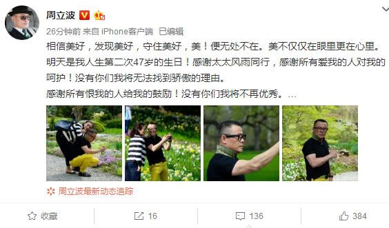 周立波发文说:相信美好,发现美好,守住美好,美便无处不在,美不仅仅在眼里更在心里。 明天是我人生第二次47岁的生日,感谢太太风雨同行,感谢所有爱我的人对我的呵护,没有你们我将无法找到骄傲的理由。感谢所有恨我的人给我的鼓励,没有你们我将不再优秀。