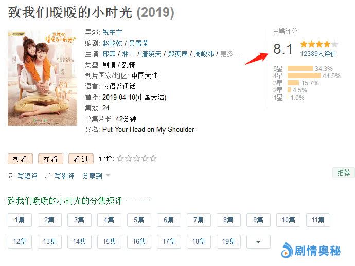 而在伴随着《都挺好》完结,虽然小编还一度进行了二刷,但是二刷似乎已经无法满足小编的欲望,而在即将陷入剧荒之际,一部网剧《致我们暖暖的小时代》的热播一度吸引了我的眼球。虽然是属于网播剧,但是该剧于4月10日开播之后,腾讯视频和豆瓣网分别给出了9.0和8.1的高分好评,不仅在口碑上一度爆棚,更是在仅仅更新八集的情况下,该剧的网播量一度高达4.5亿。