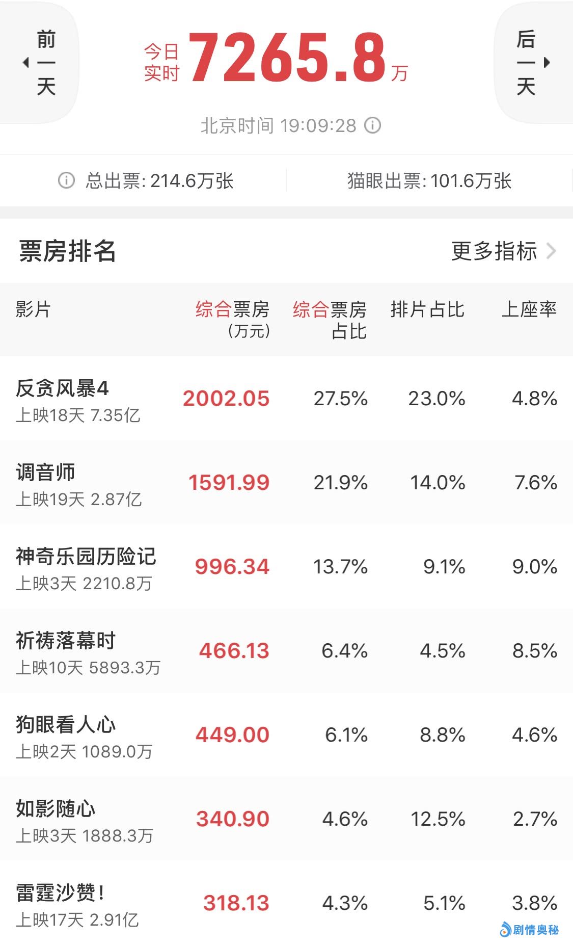 这几周上映的新片虽然有几部,但在总票房成绩上都不太如人意,比如刚刚上映3天的《神奇乐园历险记》拿下2200万总票房成绩,几乎是走在了票房扑街的边缘。另一部上映2天的国产片《狗眼看人心》,上映2天总票房1080万,同样是票房扑街了。
