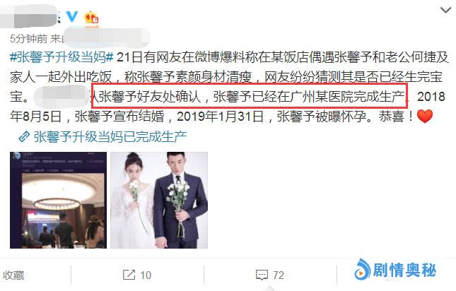 21号晚上八点左右,有记者联系到了张馨予的好友,对方证实张馨予确实已经升级当妈了,已经在广州某医院生完了孩子。张馨予从官宣结婚,再到被爆出怀孕消息,最后证实升级当妈,每一次都引起了巨大轰动。只是没想到的是,张馨予现在变得如此低调,都没“官宣”呢。