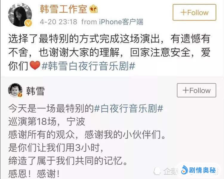 白夜行剧组已发声明,当晚观众可以退票。但是,我想,假如我是现场的观众,面对韩雪这样的状况,我表示理解和尊重,我不会退票。