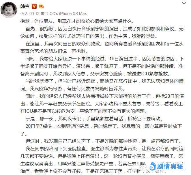 4月23日凌晨,韩雪微博发了长文,回应此事。文章很长,简要概述如下。韩雪在前一天演出完后,因为感冒的前因,又经过了演出,就发现嗓子已经哑了。在这时候,韩雪又得知自己的父亲在旅行途中突发心脏病,被送进了ICU紧急抢救。当时已经是深夜,韩雪心急如焚,一夜无眠,第二天起床发现自己失声了。